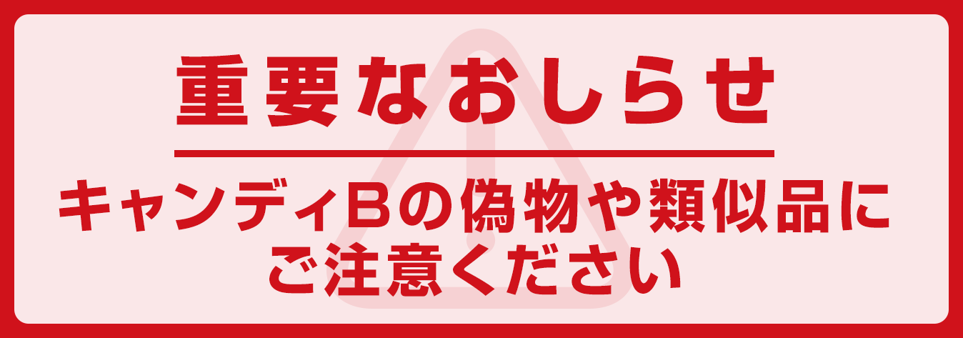 CANDY Bをお買い求めの際は、必ず弊社CANDY Bストアもしくは弊社認定の正規販売店・正規取扱店にてご購入くださいますようお願い申し上げます。